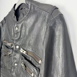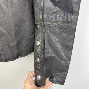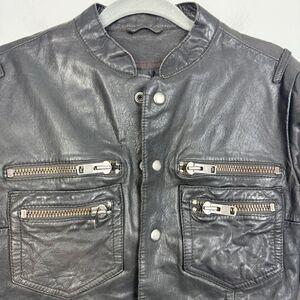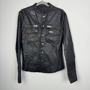 Nice dark brown leather jacket by All Saints. Definitely an older style but super trendy. Love all of the zipper details. Snap front and snap cuffs. Slightly tapered fit. Great preowned condition. Women’s size small.