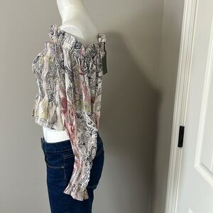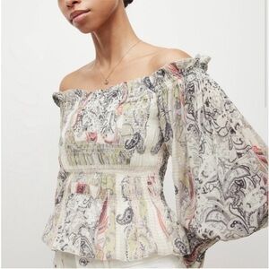 A boho-inspired paisley print animates this shoulder-baring smocked top framed by billowy long sleeves.