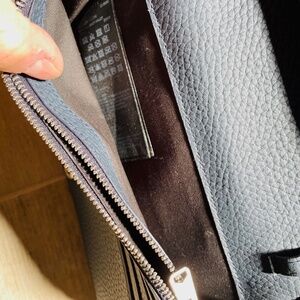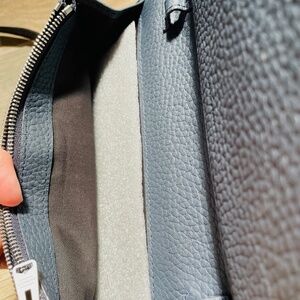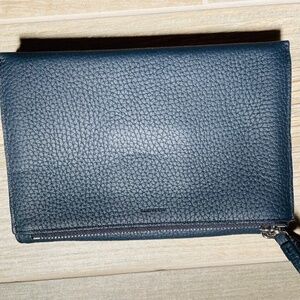 ALL SAINTS Navy Fetch Chain Leather crossbody bag. Simple and sleek with a removable and size adjustable leather strap. Missing chain strap. Front flap closure. Exterior zip pocket Interior zip and slip pockets Eight credit card slots Silver tone hardware. Measurement: 18"-21" drop, 13" W x 9.5" H x 3" D. Condition: Excellent; used once (and lost metal chain strap). Last two photos are stock showing black color.