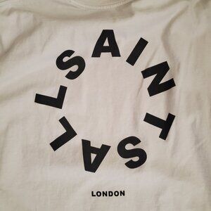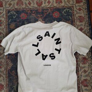 ALL SAINTS is an excellent fashion house that focuses on quality materials and sustainable manufacturing. Based out of London, they primarily manufacture their garments out of Turkey, Portugal and China. Most of their catalogue excellent, and is generally of above average quality. In my experience, the pieces made in Portugal are usually the best out of the three manufacturers. This tee is no exception. Made from 100% Organic Cotton, oversized fit, with a stylized ALLSAINTS logo in a circular configuration. This unique logo is mirrored on the back, only larger and both are centered. Has a hefty feeling to it, feels like it was made with care.