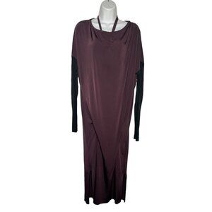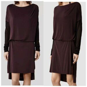 ALL SAINTS Rubia Dress Maroon Purple Sheer Black Sleeves Asymmetric Tie Up US 4