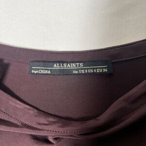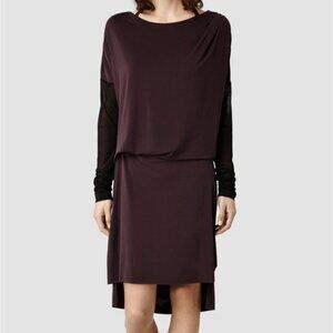 ALLSAINTS dress, preowned ALLSAINTS dress, Rubia dress, maroon dress, purple dress, sheer dress, black sleeves dress, asymmetric dress, tie-up dress, US 4 dress, designer dress, elegant dress, evening dress, cocktail dress, party dress, chic dress, modern dress, trendy dress, luxury dress, fashion-forward dress, statement dress, fitted dress, flattering dress, versatile dress, flattering silhouette, contemporary dress, stylish dress, unique dress, feminine dress, lightweight dress, breathable fabric dress, pre-loved ALLSAINTS dress, gently used dress, secondhand ALLSAINTS, date night dress, special occasion dress, boho chic dress, minimalistic dress, contemporary fashion dress