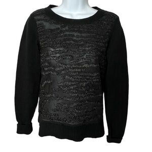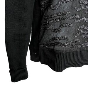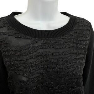 Black pullover sweater with textured metallic zebra pattern on a semi-sheer bodice. Pullover style with knitted solid sleeves and back. 100% polymide.