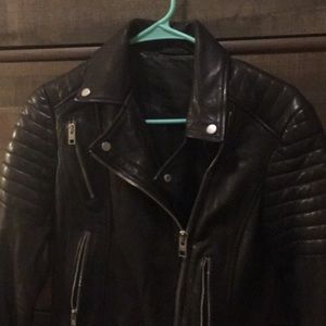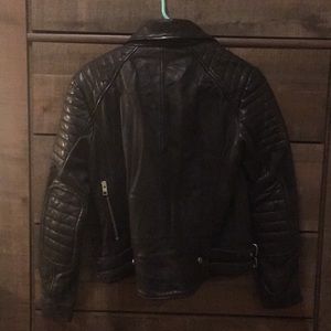 Never worn, beautiful black motorcycle jacket in black leather. Elbow patches and metal hardware in perfect condition.