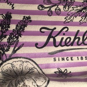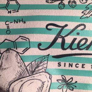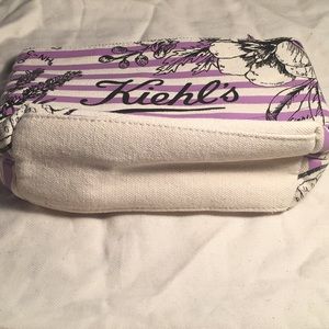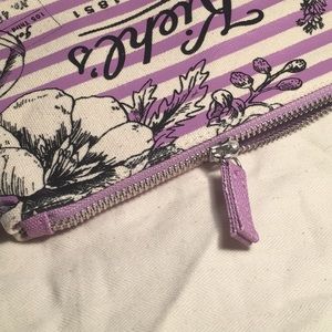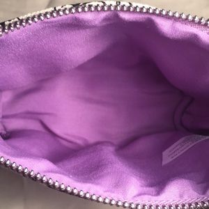 Color is cream with the designs on it being ink black. Has horizontal light green stripes across it with a light green inside. The other pouch has light purple stripes across with purple on the inside.