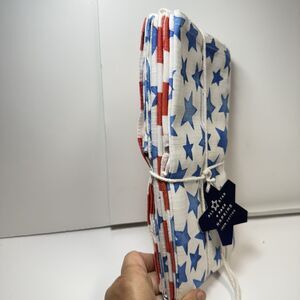 This four piece napkin set is a pack with two napkins with a white background and blue stars and two napkins with white and red stripes. Brand new in original packaging from Nordstrom. Comes from a smoke free home.