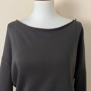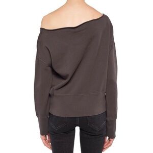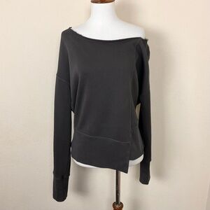 Allsaints Lando pullover in dark gray / brown, comfortable 100% Cotton French Terry, oversized relaxed fit, wide scoop off shoulder neckline, banded cuffs, asymmetric hem, drop shoulders.