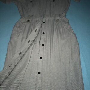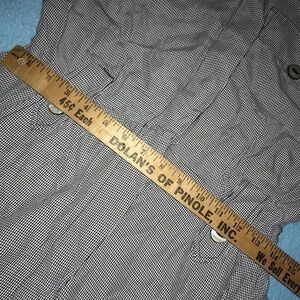 All That Jazz dress, small checks, side pockets, hidden buttons all down the front, fake buttoned chest pockets, back slit is 11 inches, belt loops, shoulder pads, vintage.