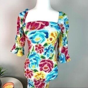 ALL THINGS MOCHI Mariana Shirred Silk Floral Dress Size Small Silk Puff Sleeves