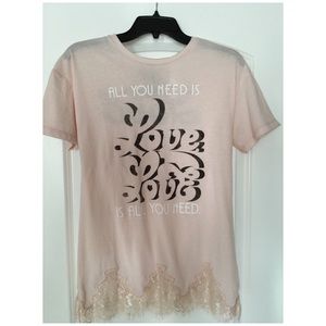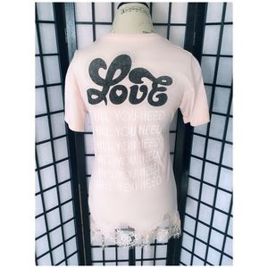 🎼🎷Prove your Beatles vibe ,...always stylish lyrics,..oh how famous to sing 🎵 it along!💌Cute top with lace details on the bottom..., 60% cotton, 40% polyester. Pale pink color top with black & white writings “All you need is Love” lyrics by Lennon & McCartney....Long top could be a tunic top,,,,,🎼❤️(last photo is showing the back of the top)🎼