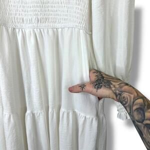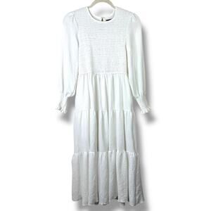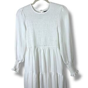 ALLANDWELL White Long Sleeve Smocked Round Neck Tiered Midi Dress Small