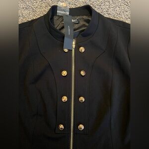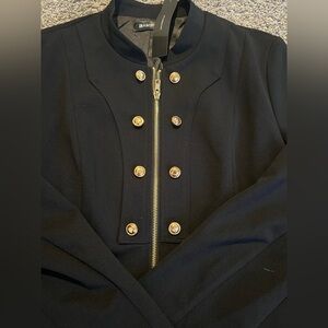 This chic black military style jacket is perfect for adding a touch of sophistication to any outfit. Featuring a sleek design with button details, it's a versatile piece for any wardrobe.
