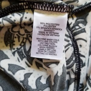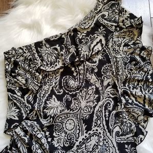 ADOREABLE..BLACK AND CREAM COLOR ONE SHOULDER RUFFLE TOP. HAS A RUFFLE DOWN THE SIDE AND AROUND THE BOTTOM. LOVED THIS TOP AND GOT MANY COMPLIMENTS. SAD I CAN NO LONGER WEAR.
