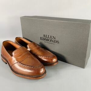 ALLEN EDMONDS "Randolph" loafers in a brown leather featuring a penny style, bench welt construction, and slip on closure. Made in USA.