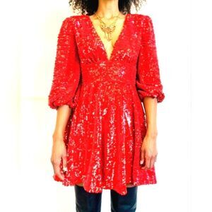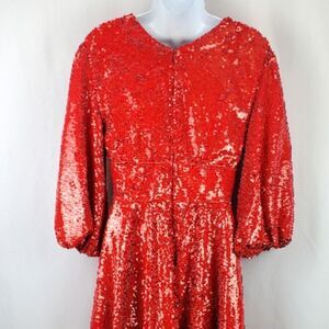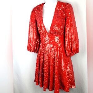 Super sexy deep V front, fitted waistband and swirly bottom. Hot red sequins that change direction for extra drama! Back zipper and puff sleeves.