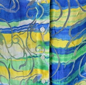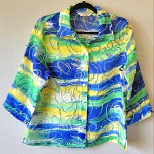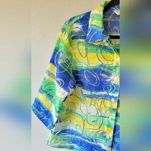 sheer, vibrant, colorful, vacation, 3/4 sleeve, collared, lightweight, beachy, coastal grandma,