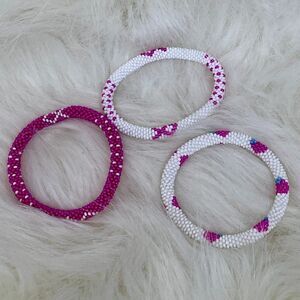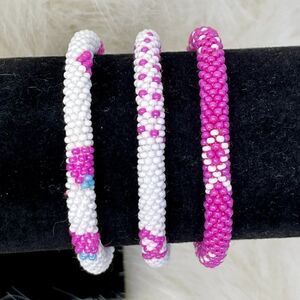 Every one of these bracelets is beaded and crocheted by hand by women in Nepal. For most of these artisans, creating these bracelets and similar pieces of jewelry is the only source of income for their families. Many of them live on family farms, and create this artwork at night or during the rainy season. Each piece is unique and has been created with care.