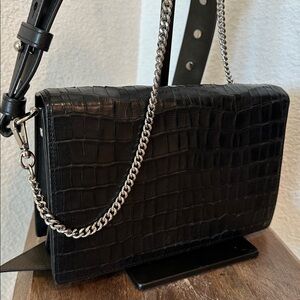 Black croc stamped leather box bag with three internal compartments. Magnetic flap closure and interior zip pocket.