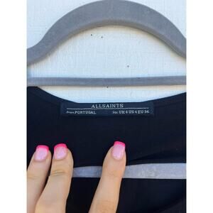 Super cute all saints black midi dress with flattering twist and draping at the waist. Sleeveless, ultra comfortable while looking put together and elevated. Great for travel as it packs light and is wrinkle resistant due to the fabric. Can dress up or down!