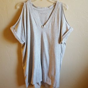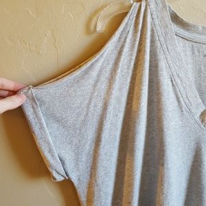 Cute & casual but stylish cold shoulder tshirt. V neck, rolled short sleeves, oversized fit. Comfortable, lightweight 100% cotton. Slightly longer in the back. Easy to through on with leggings or over a swim suit! In good pre-owned condition.