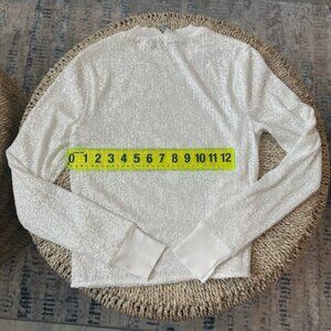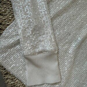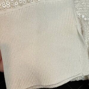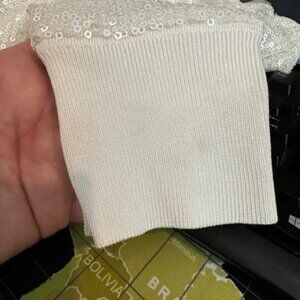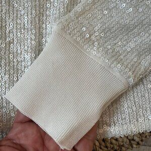 Preowned but in great condition. Worn once. This creamy winter white thin sequin sweater is perfect for the holidays! Sleeves can also be rolled up once.