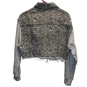 Denim leopard print body with grey sweatshirt material sleeves, ribbed cuffs