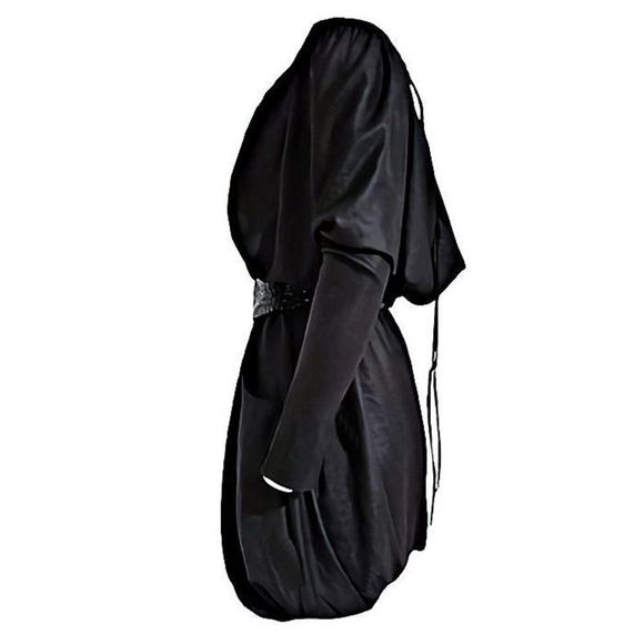 Long skinny ties adjust the neckline while dolman sleeves fit tight at the wrist.
