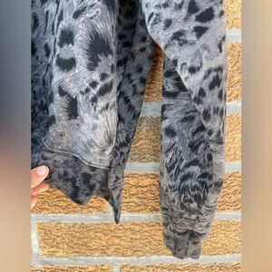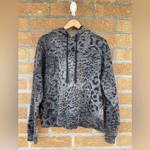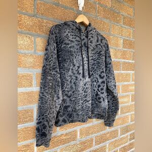 Black and gray 'Paw' oversize sweatshirt from AllSaints. Made of cotton. Hood pulled with drawstrings. Decorated with a spotted pattern.in good condition