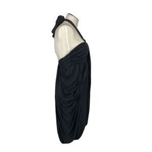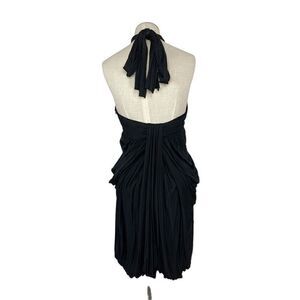 Draped black jersey modal-silk blend tie-neck halter top mini dress with bubble hem. Side zip.
