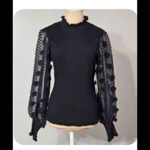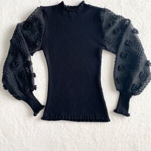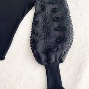 Alamos Famous womens long sleeves black top floral embroidery mesh puff-sleeves