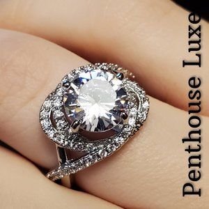 Unique micro-paved swirl band surrounding a 3ct brilliant cut simulated diamond. Sterling silver plated. Stamped "S925".