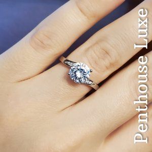 Insanely gorgeous brilliant cut white sapphire solitaire on sterling silver plated band. Accent stones on each side. Stamped 925.