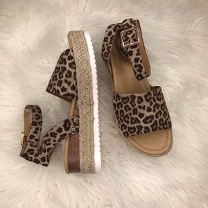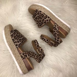 Esmerelda Leopard Print Platform Espadrille. On trend and perfect to dress up your summer outfits. So so comfortable. You can walk all day in these! Also available in snake print. Ankle strap. True to size. No trades. Bundle for discount.