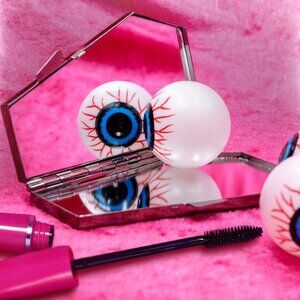 Mirror mirror for a doll, be the ghoulest one of all. New Go Away Ouija Coffin Skull Moon casket shaped compact mirror, with magnifying and normal mirrors inside, size approximately 4IN X 2 IN. Black on white graphic image with chrome hardware. Hinged and latched to keep the mirror safe and ready inside your purse, bag or wallet. Great for reapplying lipstick or a quick makeup check. I have a lot of other styles of these in my closet as well. Gothic, punk rockabilly!