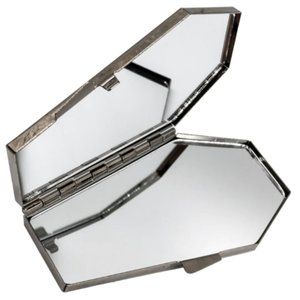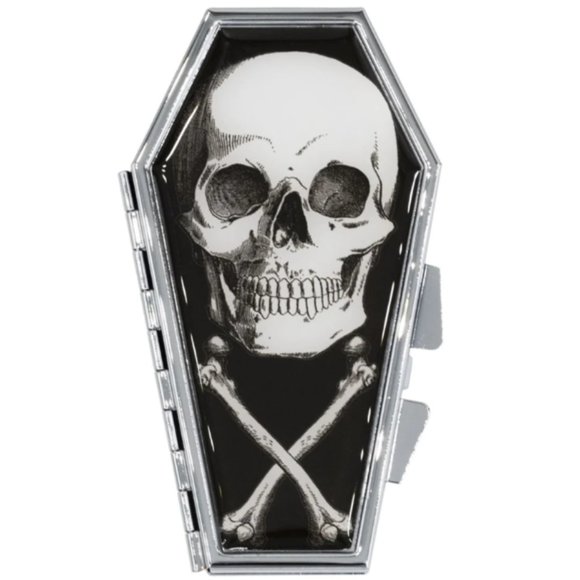 Mirror mirror for a doll be the ghoulest one of all. Keep yourself looking like a bone-afide stunner on the go with this Anatomical Skull black and white coffin shaped compact mirror. This handy coffin compact includes one non-magnified mirror and one magnified mirror inside and fits perfectly in your purse or pocket so you can stay looking your best all through the night. Size approx 4 in. X 2 in. Designed in California. Great for reapplying lipstick or a quick makeup check. I have a lot of other styles of these in my closet as well. Gothic, punk rockabilly!
