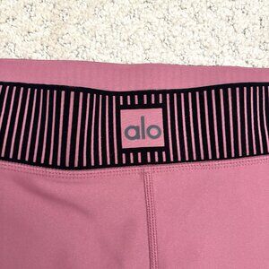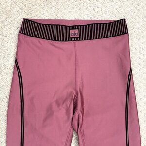 ALO Airlift High Waist 7/8 Line Up Leggings, women’s size small! Size is based on measurements: 13” waist, 10” rise, 25.5” inseam. Light pink color with black accent detail, ribbed textured waistband.