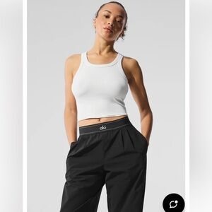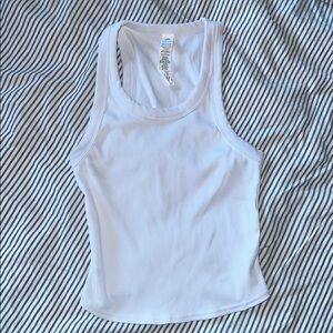 Alo Yoga white ribbed tank top. Features a classic sleeveless design. The name says it all: The Goddess Ribbed Go-To Tank fits like your best basic tank, with a racerback and cropped hem—but it’s made from a buttery-soft, ribbed performance fabric that’s perfect for practice. Layer it over a sports bra for movement, then pair it with trousers for an effortless street-style look.