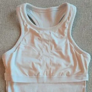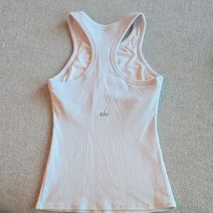 Sleek ribbed tank with racerback design. Soft, stretch fabric for easy movement. Fitted silhouette that flatters the waist. Versatile for workouts or everyday layering.
