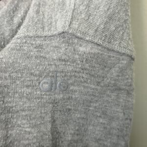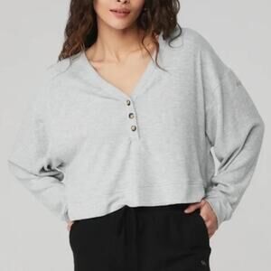 ALO Yoga Alolux Soho Henley top. V-neckline. Heather grey. Three vertical buttons at chest; dark grey and black buttons. Cuffed sleeves and waist. Long sleeves. Oversize fit. Very cozy. Size tag removed but purchased as a medium.