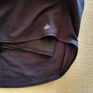 Tennis Pickleball Yoga - perfect. This soft, stretchy skirt has inner shorts, and is super cute and comfortable. ALO makes awesome athleisurewear, for active, or casual. Flirty, nice flare. 92% polyester, 8% spandex. Wide waistband sits nicely and is extra cute with crop tops or workout tops.