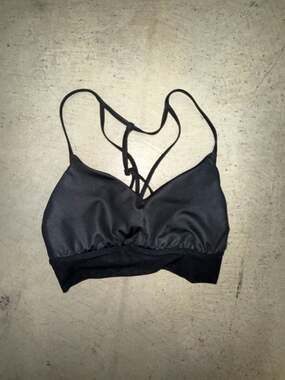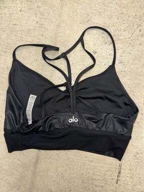 Alo Yoga Interlace Bra, Black, Size M — Sophisticated design with delicate strappy back detailing. This high-performance sports bra features moisture-wicking technology and a four-way stretch for ultimate comfort during yoga, pilates, or studio practice. The multi-strap back adds a touch of elegance and support. Excellent used condition. No visible pilling or flaws. Material: 86% Polyester, 14% Spandex.