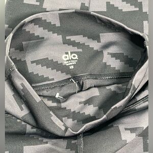 👉🏻 These leggings feature a black and gray houndstooth pattern and the Alo logo on the left leg. The Airbrush fabric is known for its compressive and sculpting properties, providing a smooth and supportive fit. These leggings are suitable for workouts and everyday wear, reflecting the brand's focus on both fashion and function.