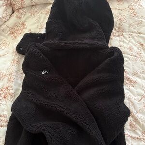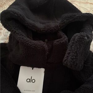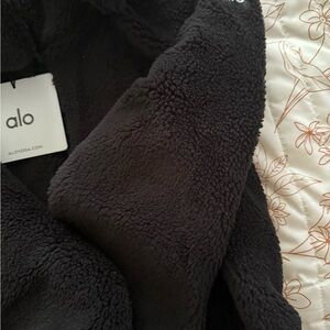 Cozy black puffer with fleece texture. Perfect for warmth and style.