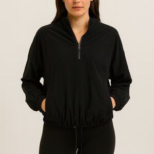 Stylish black jacket with half-zip design. Elastic cuffs and hem. Perfect for casual wear.
