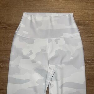 Alo Yoga comfortable leggings with a modern gray and white camo design. Ideal for active days. Size S. I believe they are 7/8 length or ankle length. Super nice sleek and thick material. Appears to have that “buttery soft” feel but a lot thicker than most. High waisted. No pockets. Appear to have never been worn. In great condition other than a little bit of dirt on the back of the L leg. Otherwise no flaws, stains or holes.