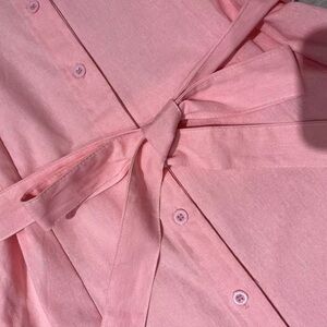 Stylish pink midi dress with a classic collar. Features a button-down front and waist tie. Perfect for versatile wear.