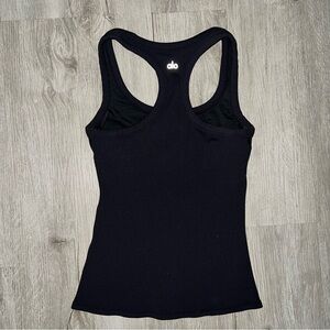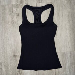Sleek black tank with racerback design. Ideal for workouts. Soft and comfortable fabric.
