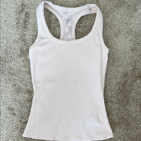 Experience the perfect blend of style and comfort with the ALO Yoga light pink Fitted Ribbed Tank Top. This sleek top features a tank top design with a fitted silhouette and ribbed texture, making it ideal for both athletic and casual occasions. Its stretchy fabric ensures a snug fit, while the ribbed edging adds a touch of durability and style. Padding included in shelf bra. In great condition. Size Small.