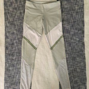 ALO Yoga Sheila leggings in Vapor Grey / White Glossy / Sea Mist green Glossy / White with V stripes and shiny power mesh panels, size small.