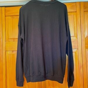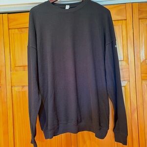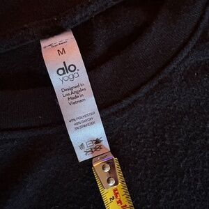 Black ALO Yoga Soho pullover in size medium. This is oversized and looks more like an XL in person. The shirt is darker than the first 2 photos and is a true black. This shirt is known for pilling (this shirt has) because they market it that way. They say that each wash will give it a more "lived- in" look. This is the style and it does have that "lived-in" look. This is a lighter pullover and feels a lot like loungewear. Still has the neck tag. Measurements are approximate